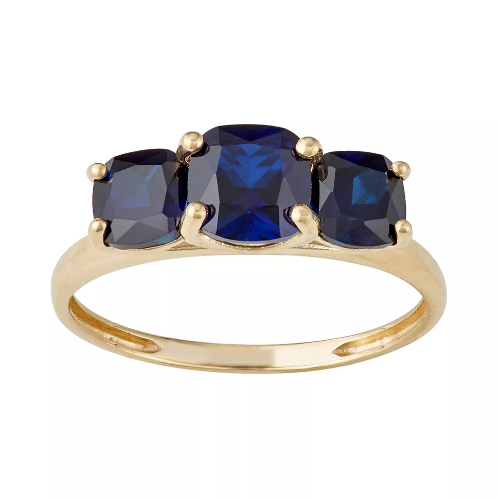 Decorated with a trio of cushion-cut gemstones, this 10k gold ring is an eye-catching accent to your favorite attire.