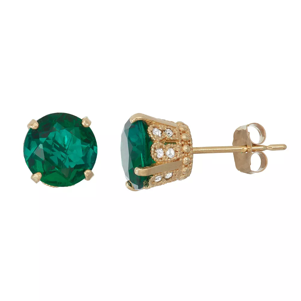 These beautiful 10k gold stud earrings feature lab-created emerald and diamond gemstones for a dazzling look that’s perfect for any occasion.
