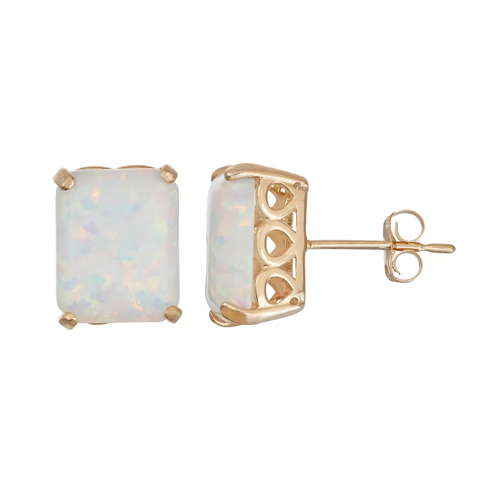 Shimmering with lab-created opal gemstones, these emerald-cut stud earrings offer sophisticated style.
