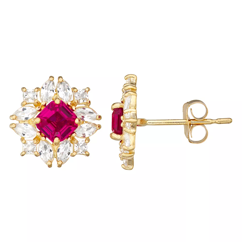 Decorated with lab-created ruby and white sapphire gemstones, these 10k gold stud earrings offer sophisticated style.