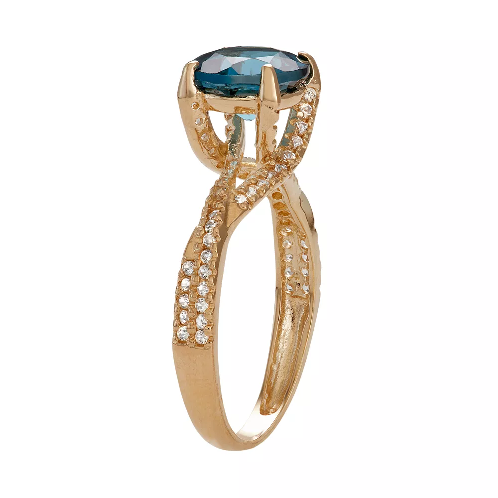 Featuring London blue topaz and lab-created white sapphire gemstones with a unique crisscross band, this 10k gold ring offers a luxurious look.