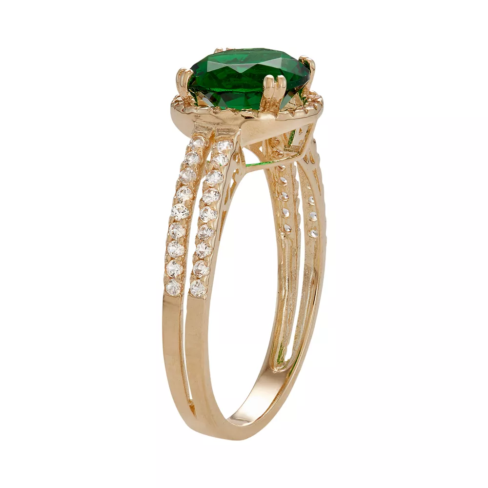 Add a gorgeous glow to your look when you don this scintillating simulated emerald and lab-created white sapphire halo ring.
