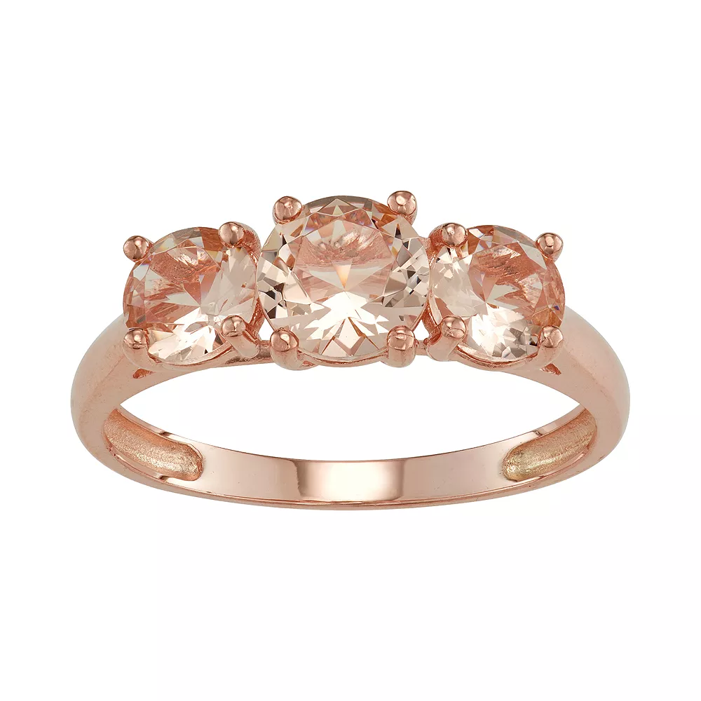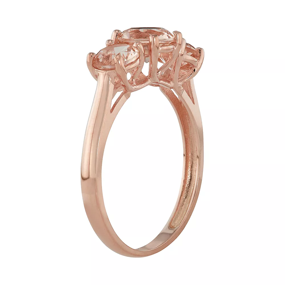 Adorned with three round-cut simulated morganite gemstones this 10 rose gold ring is altogether captivating.