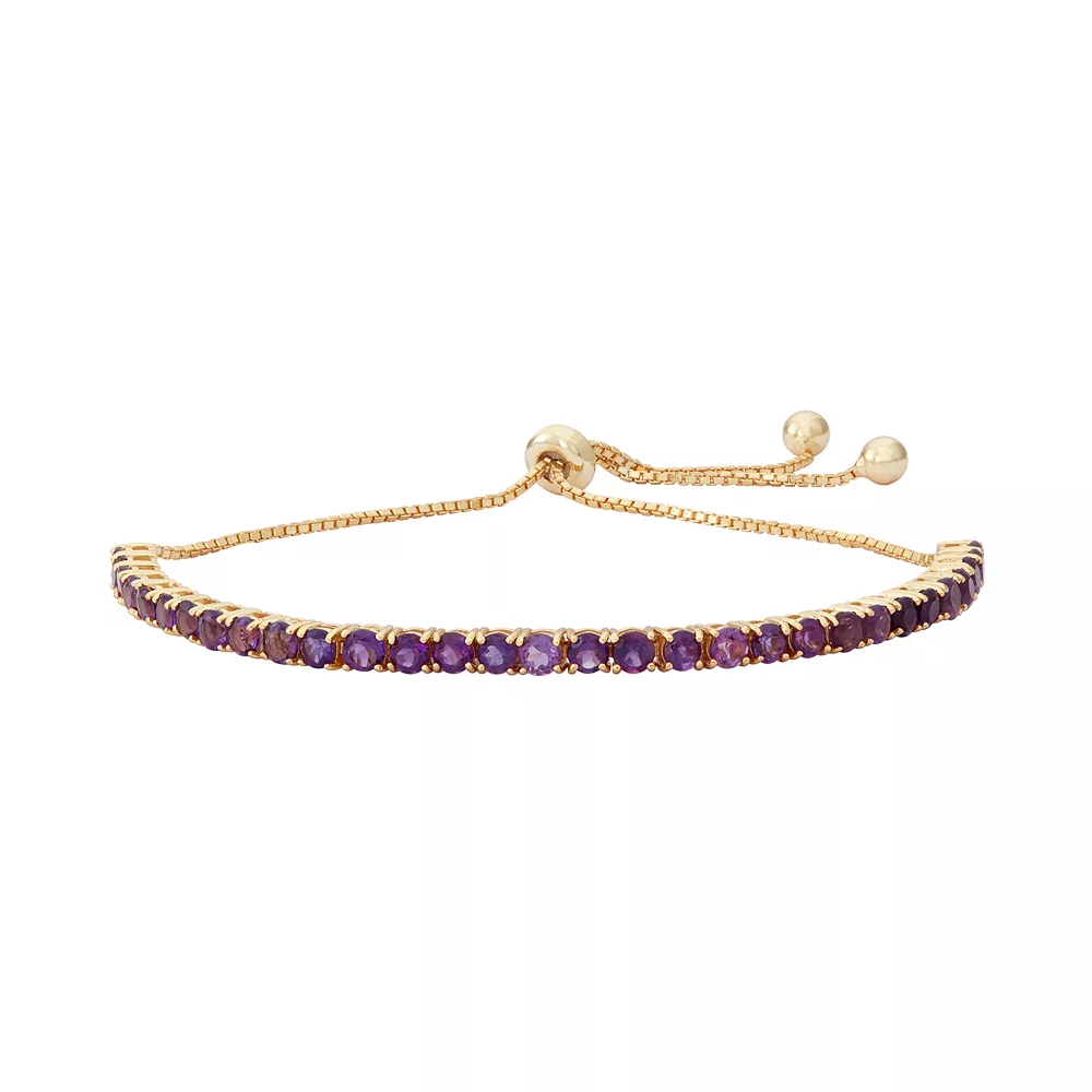Adorned with round-cut genuine amethyst stones, this adjustable lariat bracelet abounds with elegant beauty.