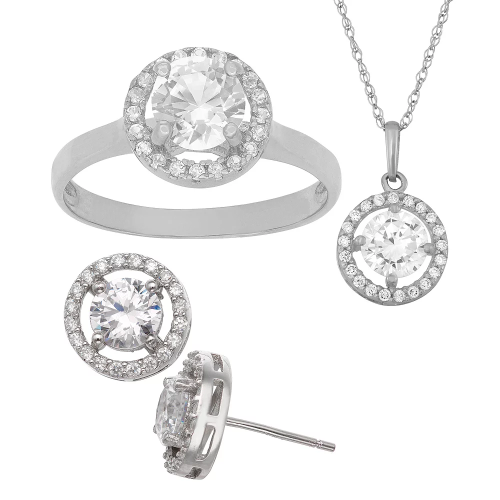 This 3 piece necklace, earring and ring set, featuring 14k gold over sterling silver and a halo design create a lovely gift she’s sure to cherish.