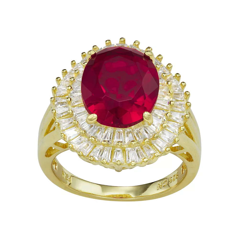 Add a touch of eye-catching elegance to your ensembles with this 14k gold simulated garnet and cubic zirconia oval halo ring.