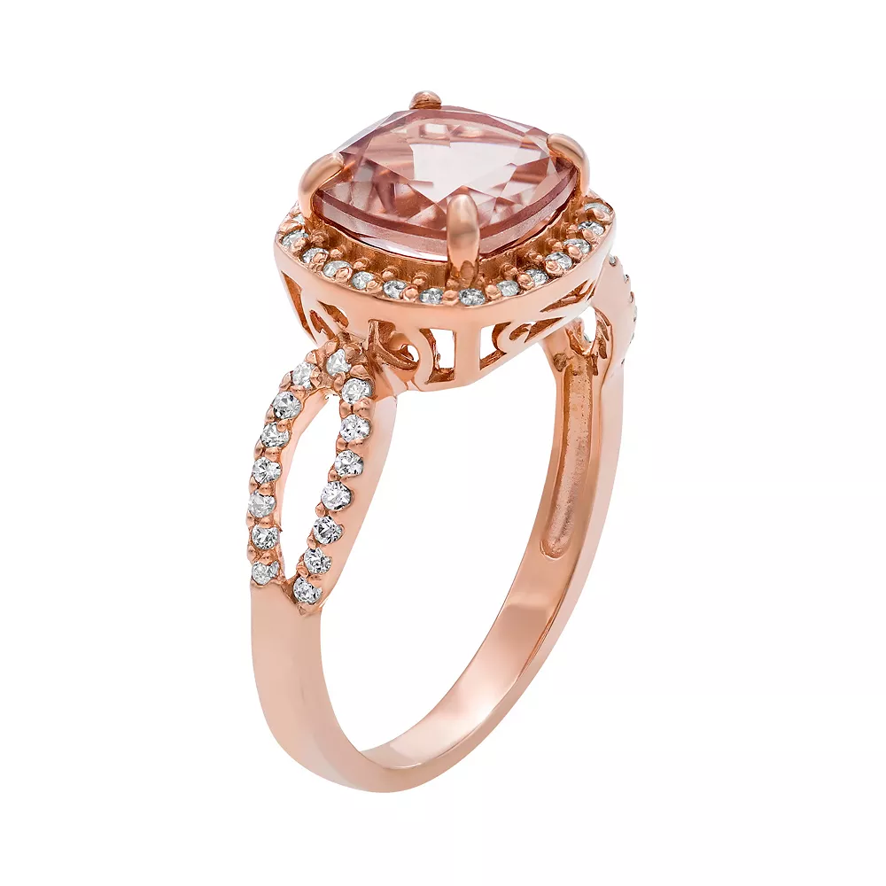 Enhance your ensemble with this timeless simulated morganite and lab-created white sapphire halo ring.