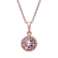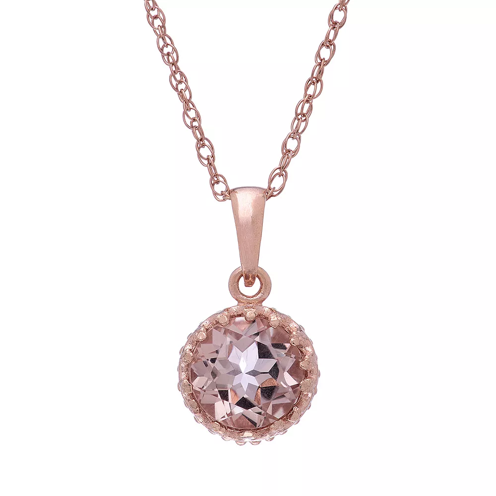 A round-cut simulated morganite stone in a crown-like setting makes this 14k rose gold-over-sterling silver pendant a piece fit for royalty.