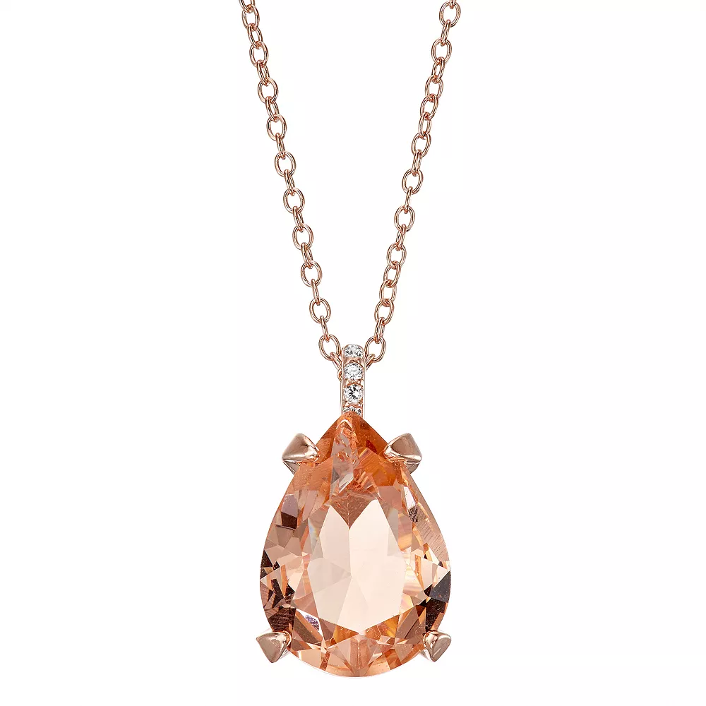Designed with an eye-catching simulated morganite gemstone, this 14k rose gold-over-silver teardrop pendant is simply captivating.