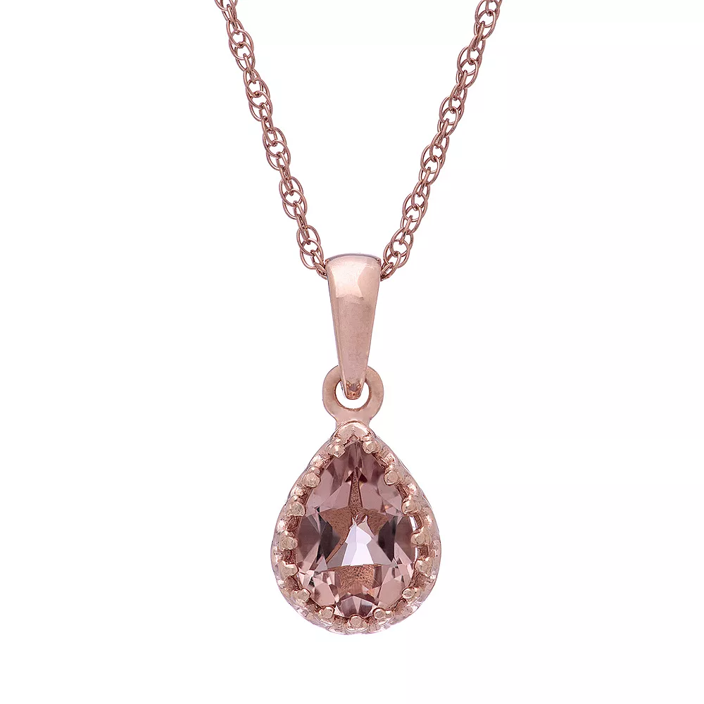 A pear-cut simulated morganite stone in a crown-like setting makes this 14k rose gold-over-sterling silver teardrop pendant a piece fit for royalty.