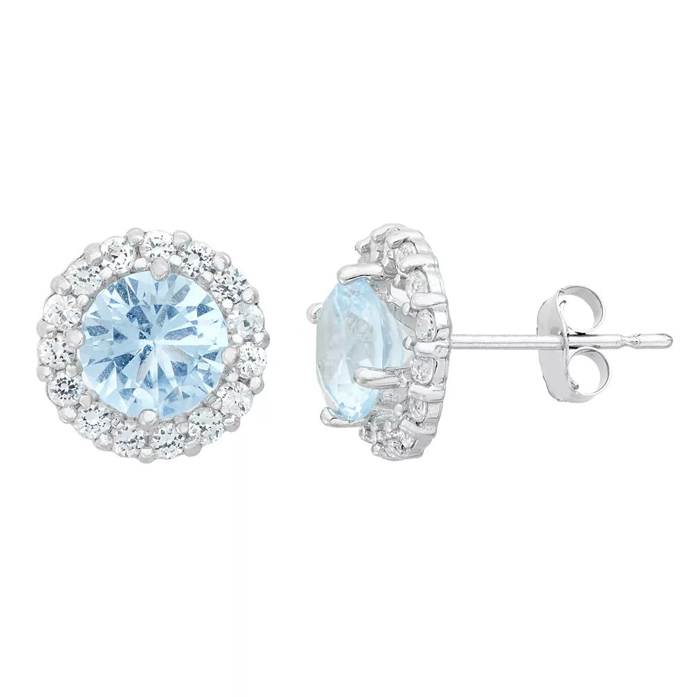 Round-cut aquamarine stones framed by white topaz stones create a breathtaking halo design on these 10k white gold stud earrings.
