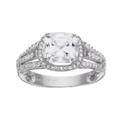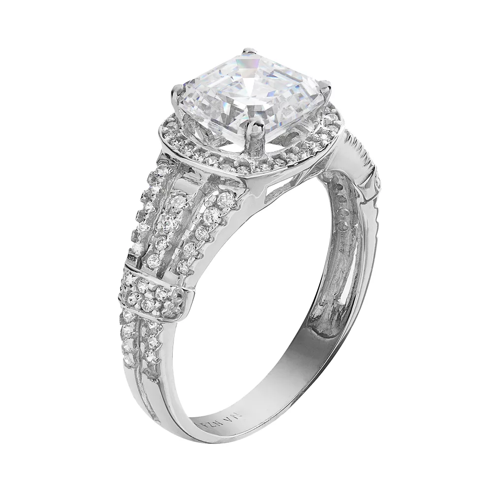 An asscher-cut cubic zirconia center stone makes this 10k white gold ring a dazzling choice. Cubic zirconia stones adorning the split-shank band and creating a tiered halo design make it the perfect way to elevate your ensemble.