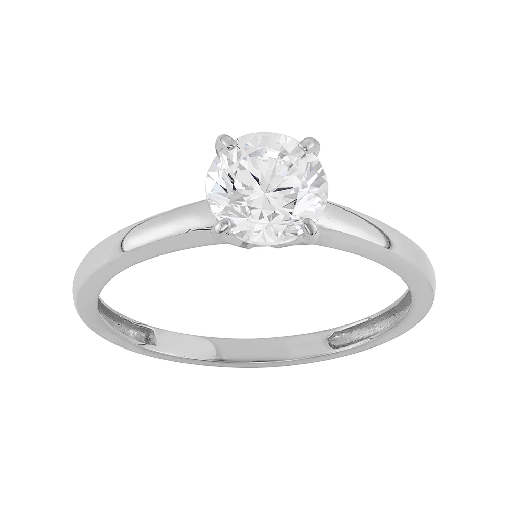 A round-cut cubic zirconia solitaire makes this 10k gold engagement ring the perfect way to let her know how much she’s loved.