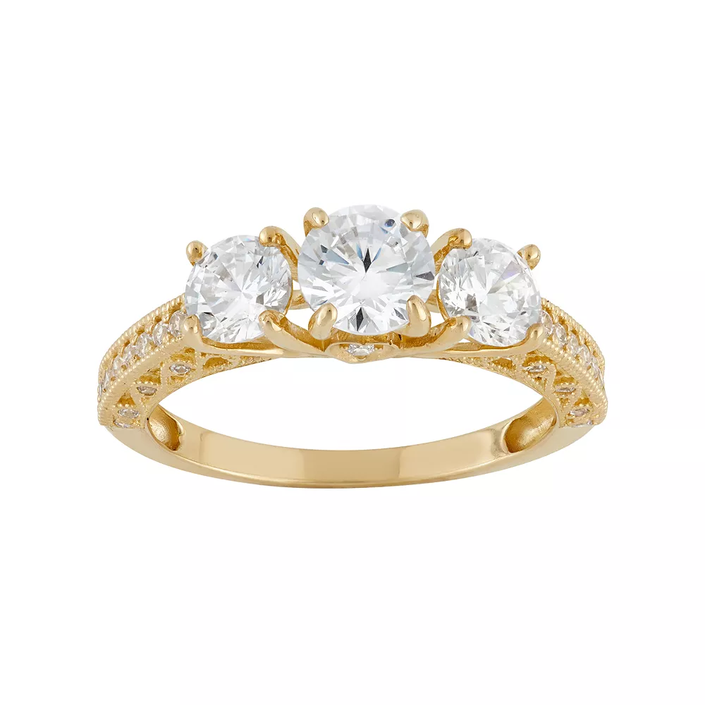 Enchant her with this 10k gold engagement ring. Round-cut cubic zirconia stones in a three-stone design make it a stunning choice. Cubic zirconia stones and milgrain details adorning the band add the perfect finishing touch.