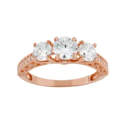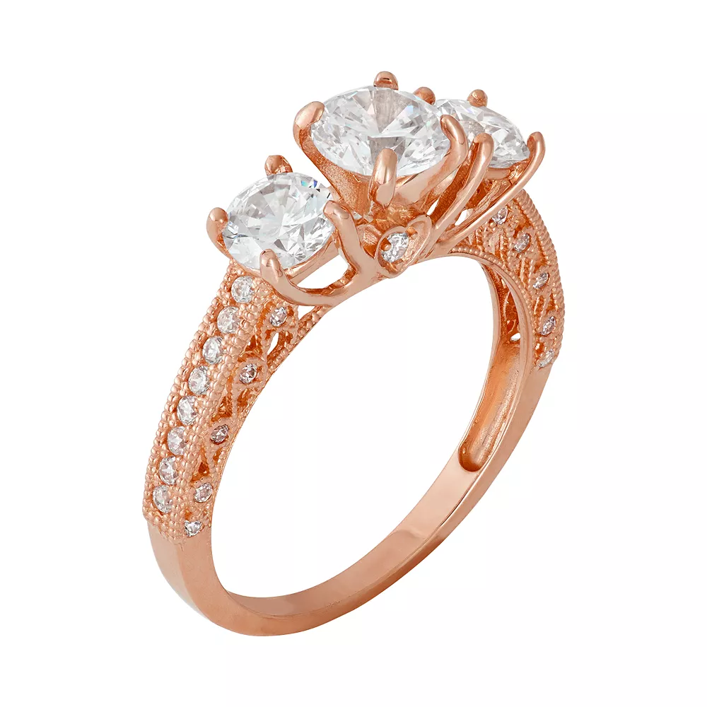 Enchant her with this 10k rose gold engagement ring. Round-cut cubic zirconia stones in a three-stone design make it a stunning choice. Cubic zirconia stones and milgrain details adorning the band add the perfect finishing touch.