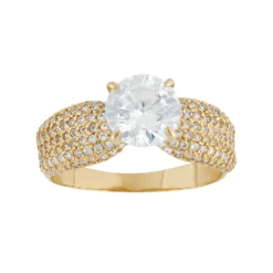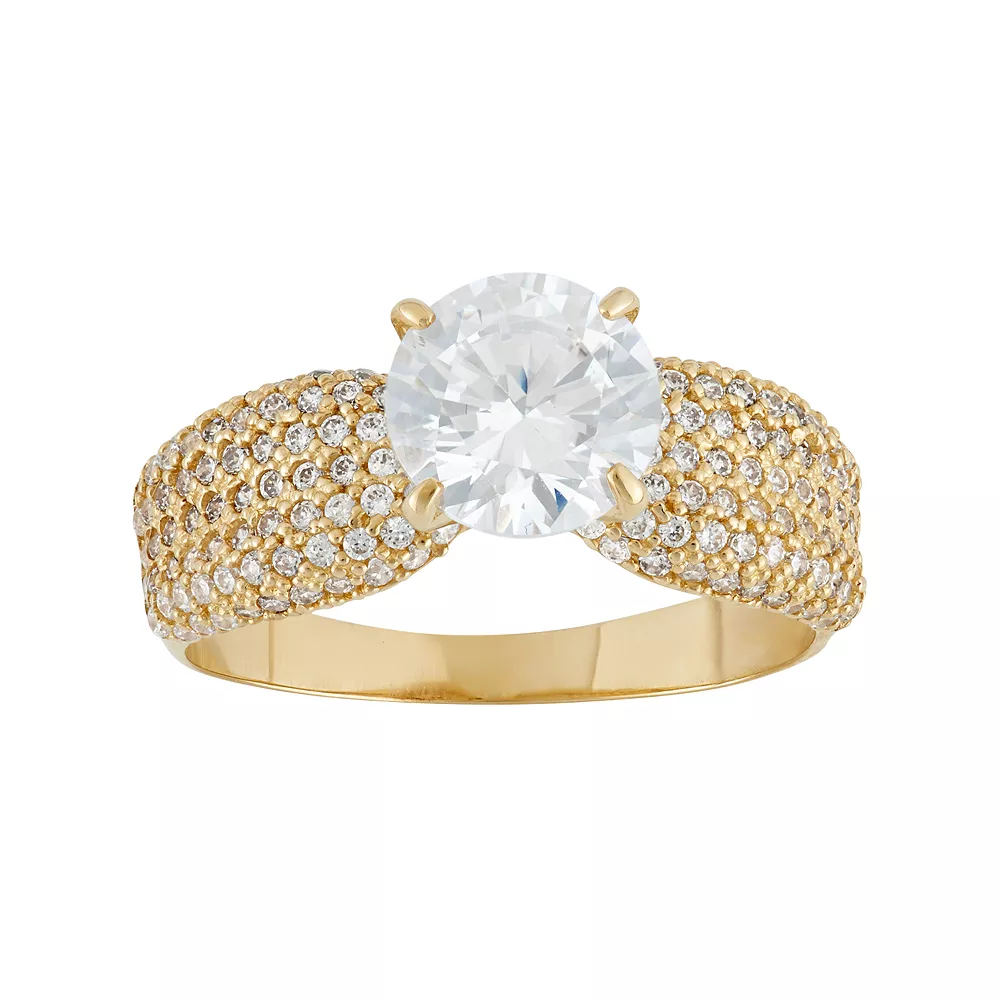Take her breath away with this 10k gold engagement ring. A round-cut cubic zirconia center stone sparkles from every angle, while cubic zirconia stones encrusting the band add dazzling beauty.