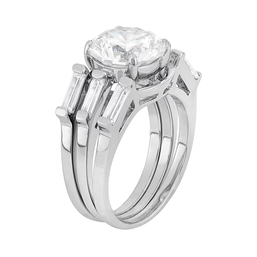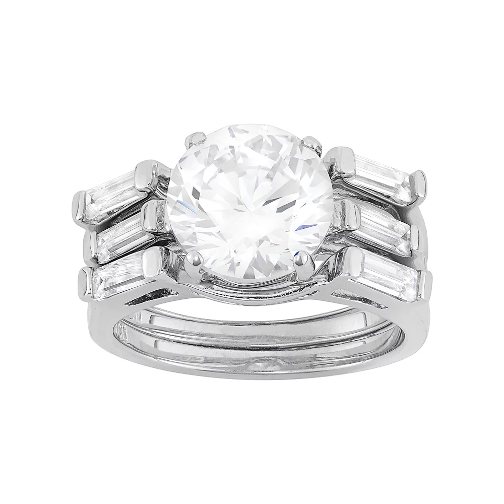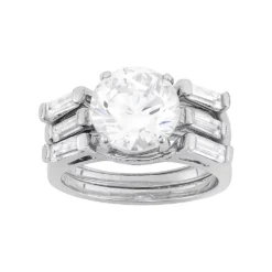 Present her with the gift of a lifetime with this impressive engagement ring set. A round-cut cubic zirconia center stone serves as the focal point, while two shadow wedding bands accentuated with round-cut cubic zirconia stones complete the dazzling design.