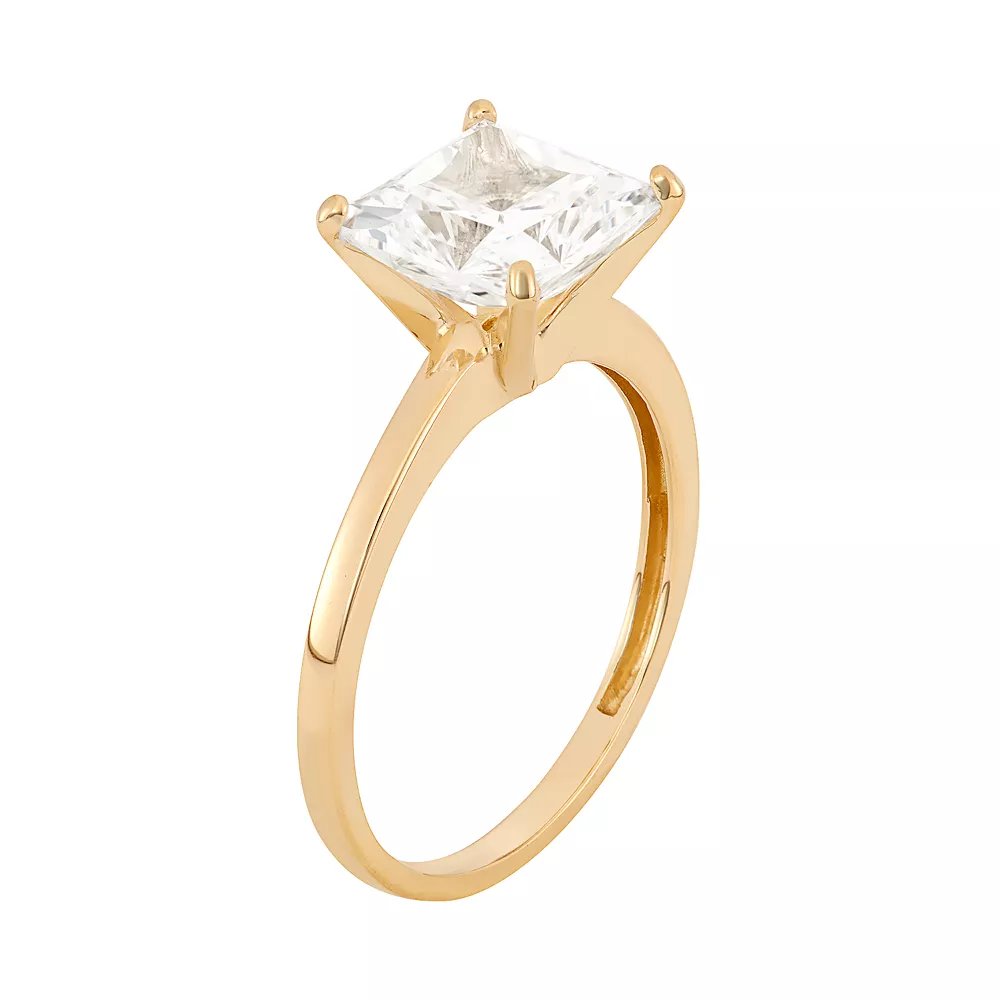 A princess-cut cubic zirconia solitaire makes this 10k gold engagement ring the perfect way to let her know how much she’s loved.