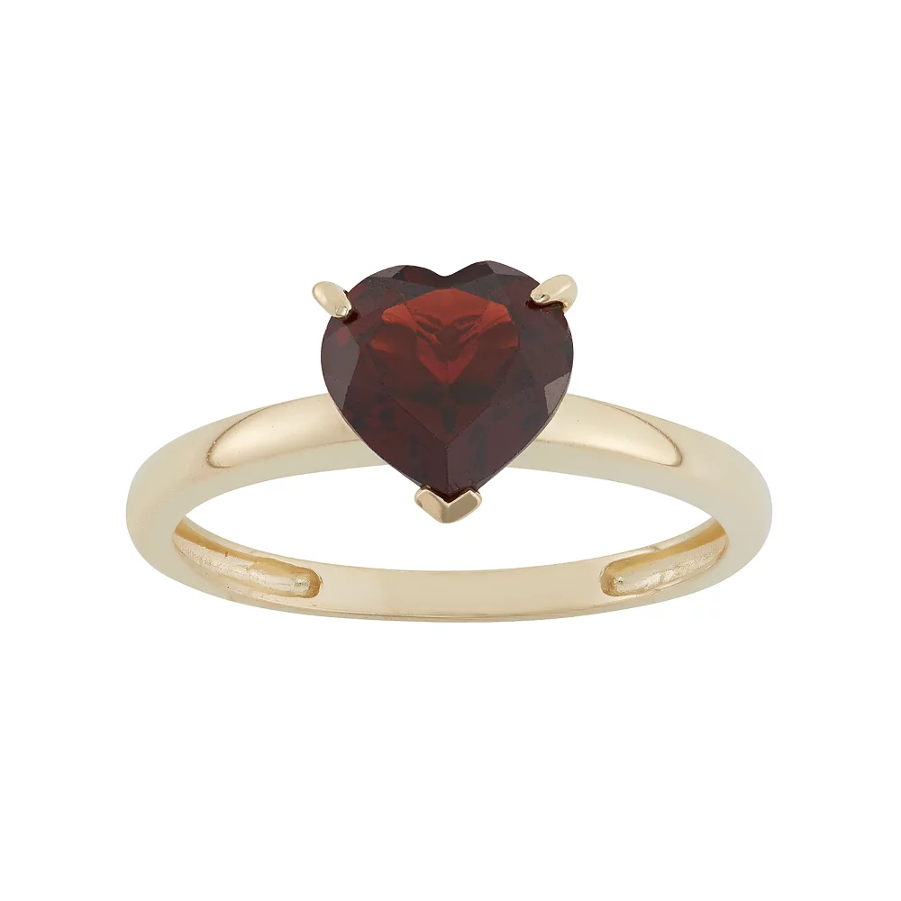 A heart-cut garnet stone gives this 10k gold ring feminine beauty.