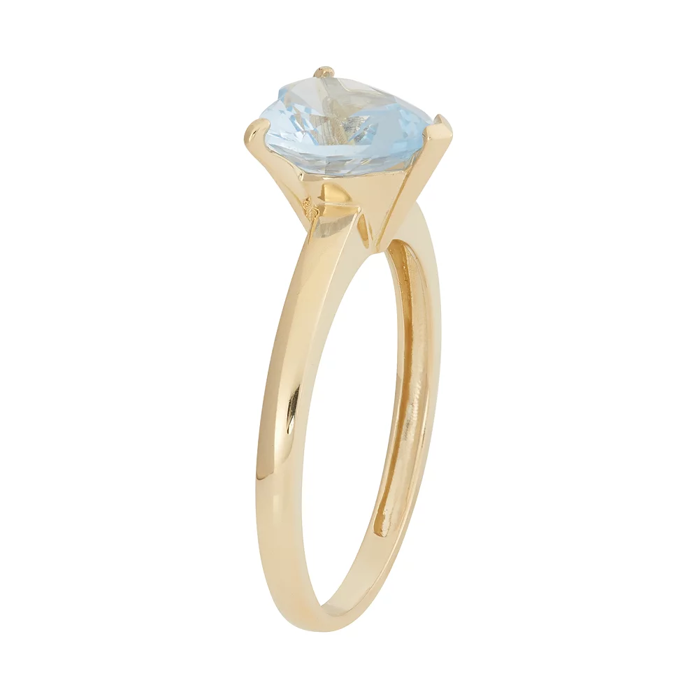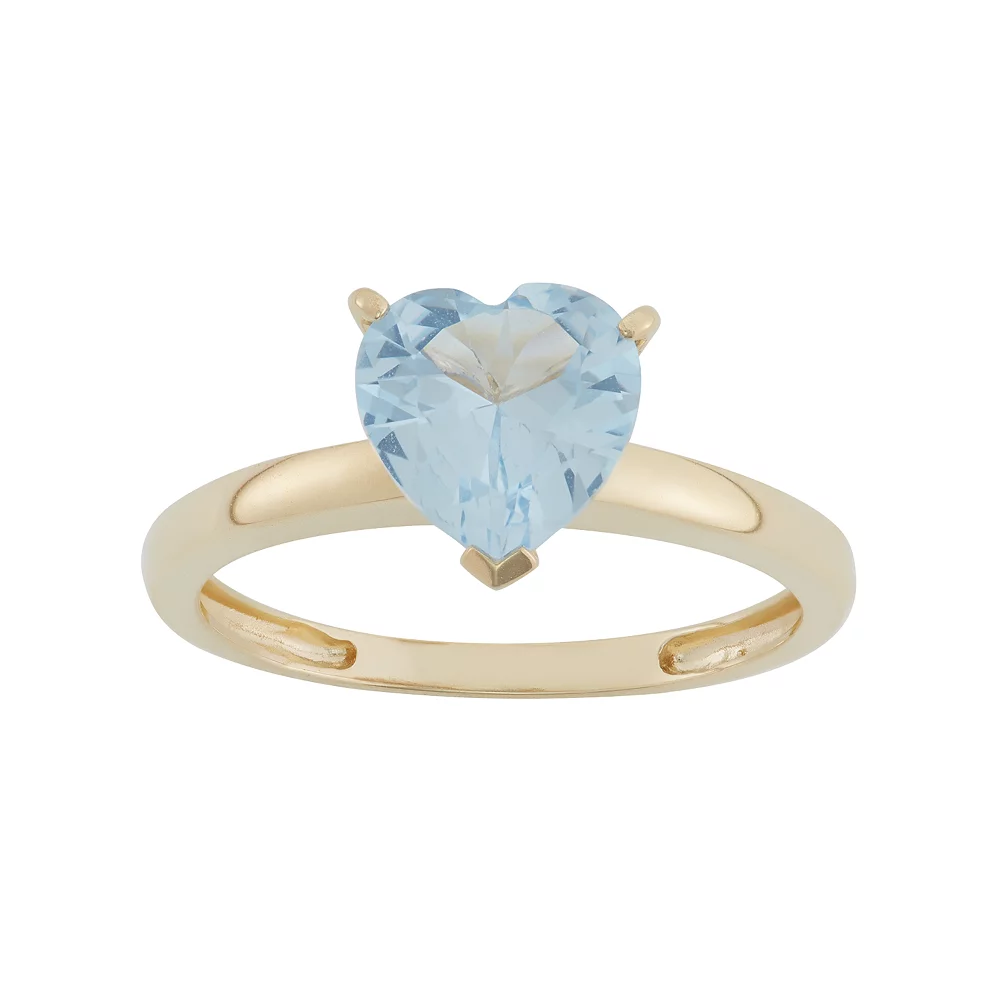 A heart-cut lab-created aquamarine stone gives this 10k gold ring feminine beauty.