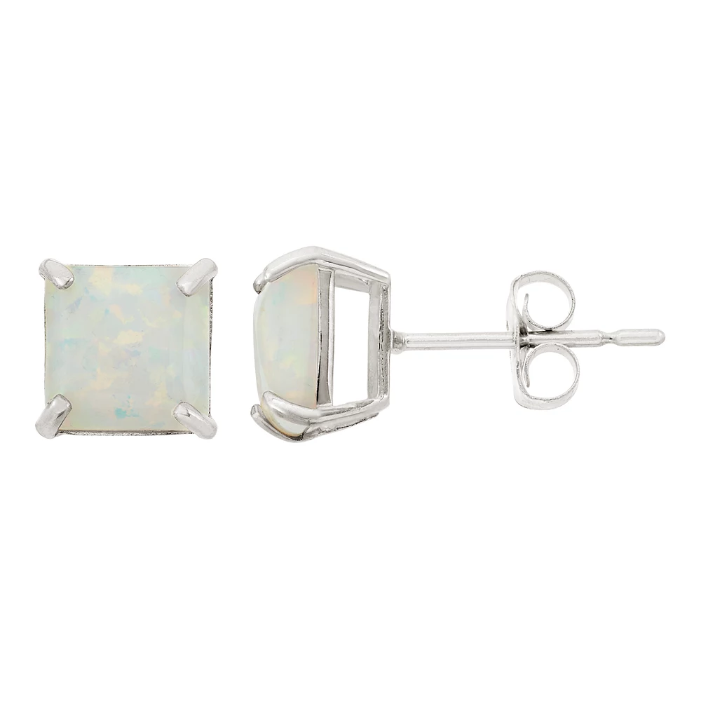 Princess-cut, lab-created opal stones give these 10k white gold earrings dazzling beauty.