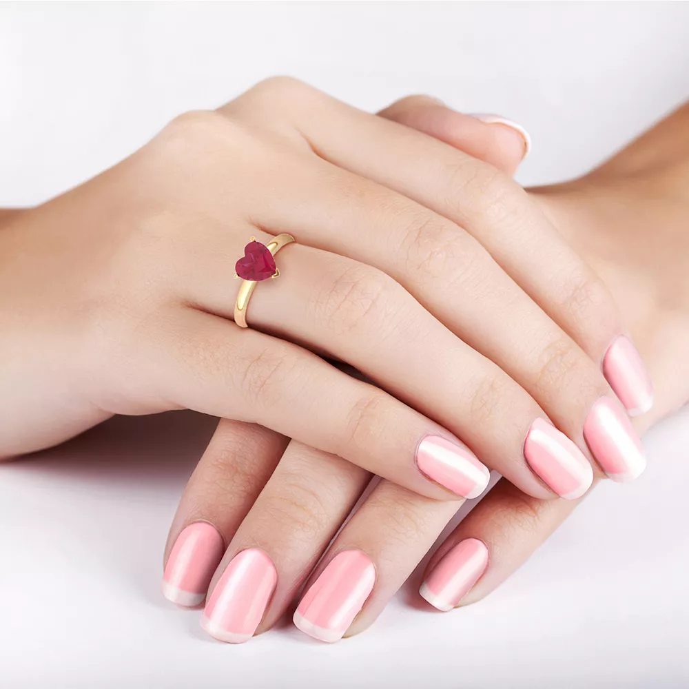 A heart-cut lab-created ruby stone gives this 10k gold ring feminine beauty.