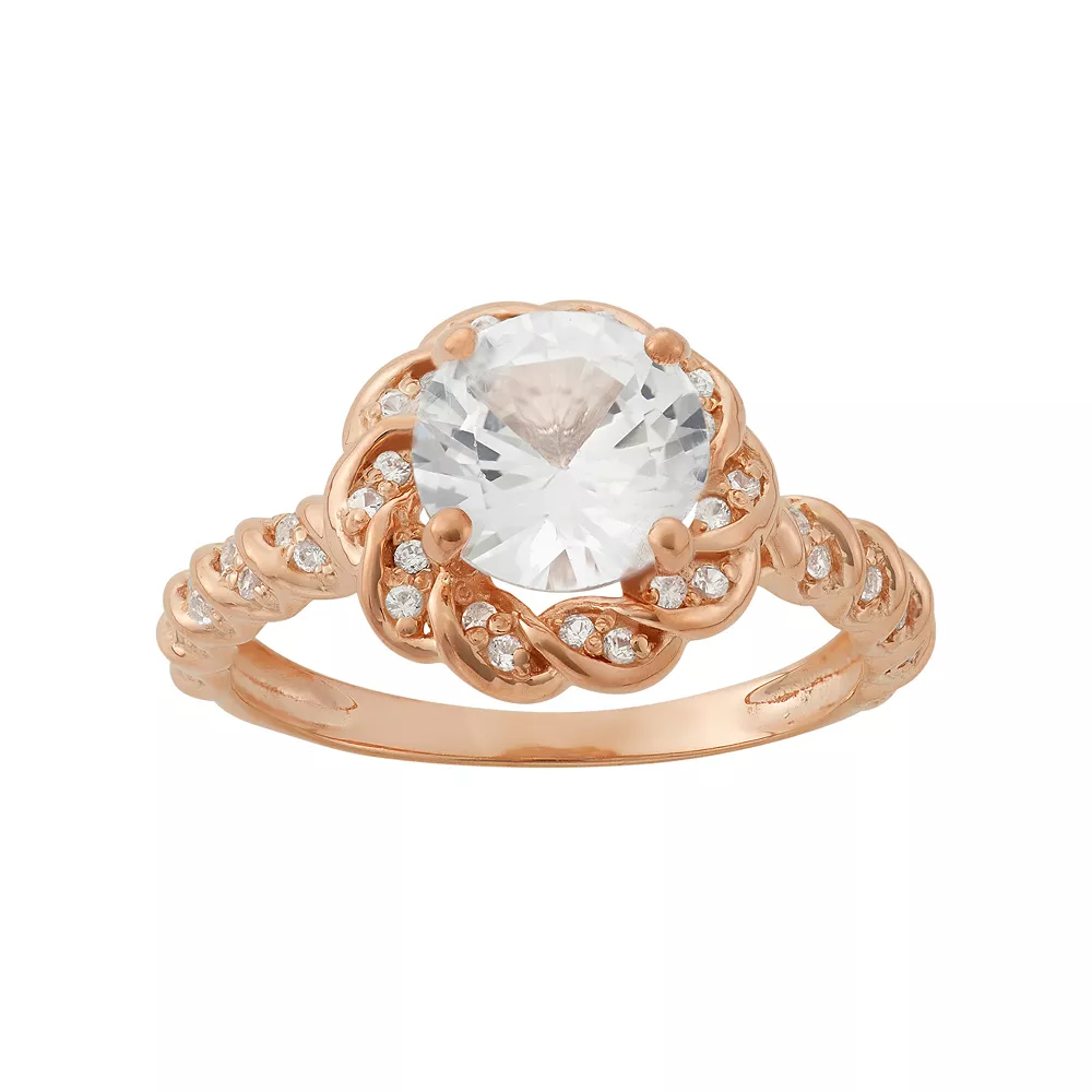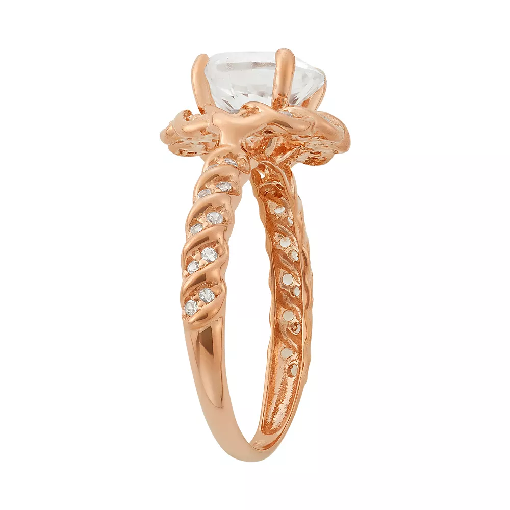 Adorned with lab-created white sapphires situated in a halo motif, this ring exudes elegant appeal. Captivate every time you wear this gorgeous 14k rose gold over sterling silver ring.
