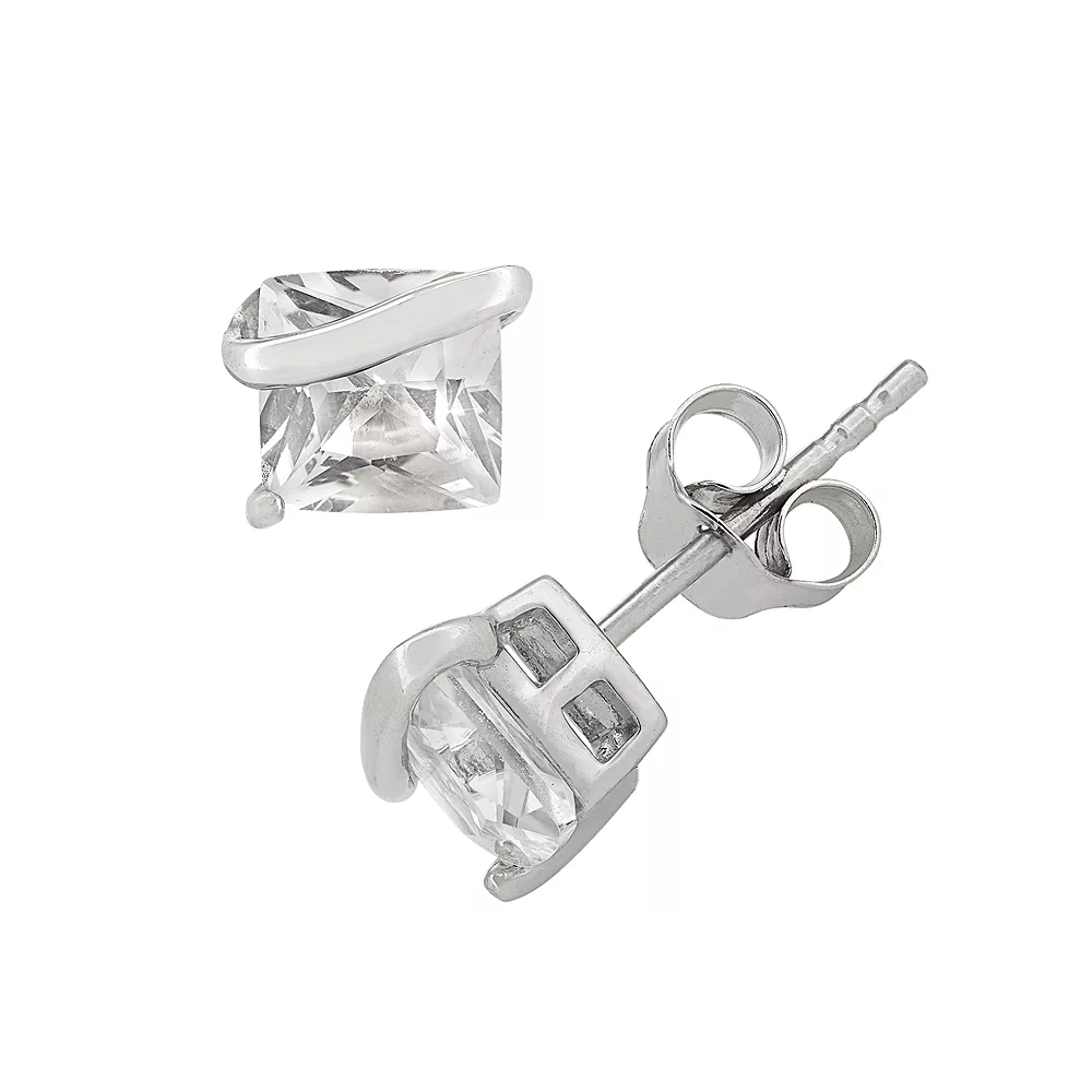 Wrapped princess-cut, lab-created white sapphire stones make these sterling silver studs a modern pair.