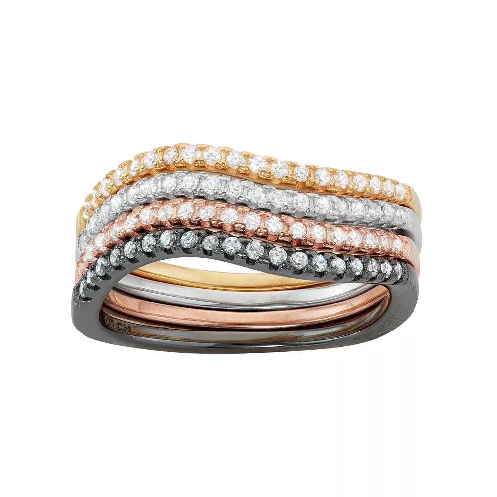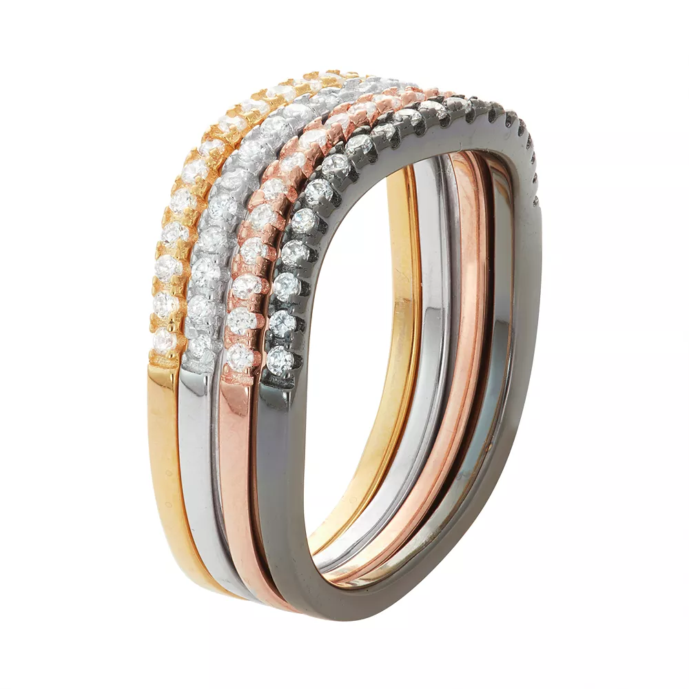 Shimmering round-cut cubic zirconia stones make this multi-tone swirl stack ring set a stylish must-have.