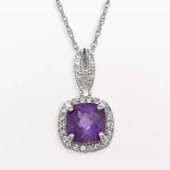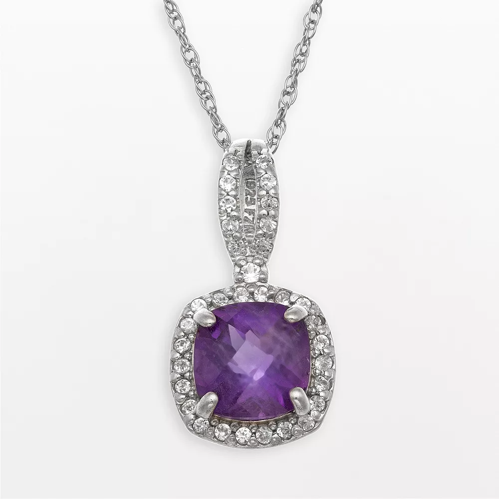 Adorned with amethyst and lab-created white sapphire stones, this sterling silver square halo pendant is absolutely dazzling.