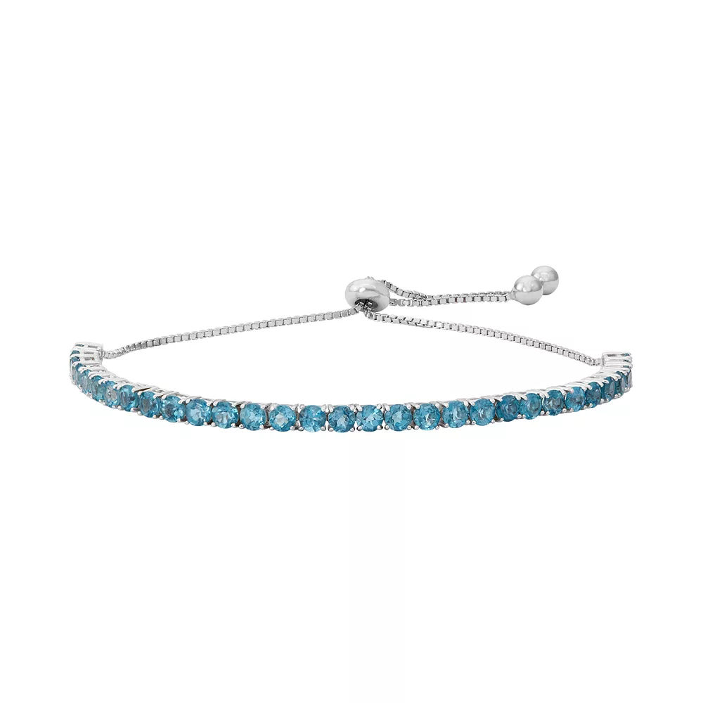 Adorned with round-cut genuine blue topaz stones, this adjustable lariat bracelet abounds with elegant beauty.