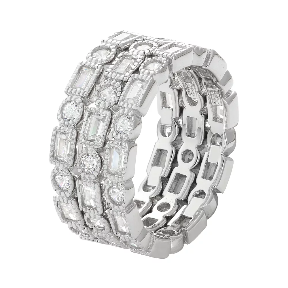 With alternating round- and baguette-cut cubic zirconia stones, this stackable eternity ring set offers elegant appeal.