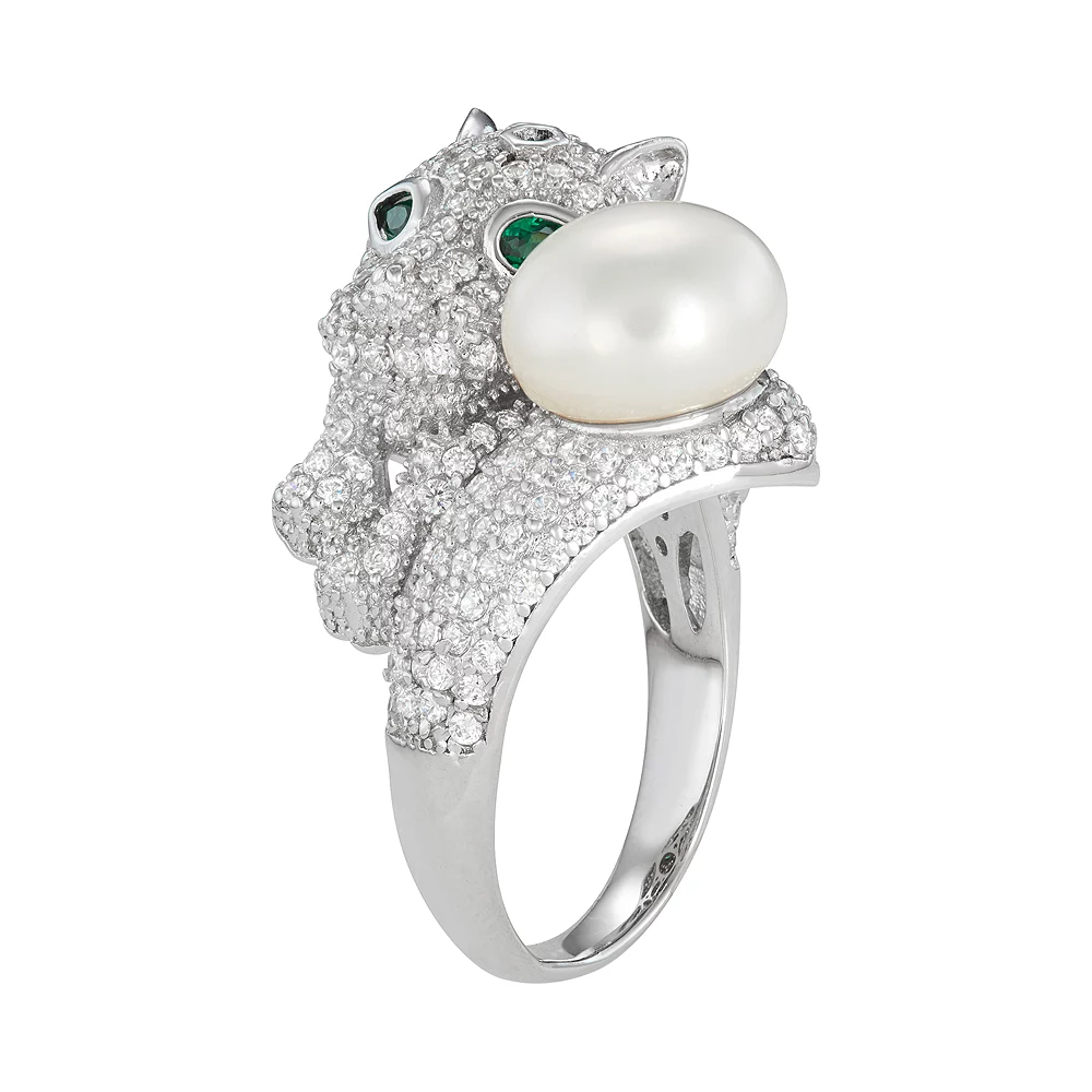 Adorned with a freshwater cultured pearl center stone and cubic zirconia accents, this panther ring enchants from every direction.