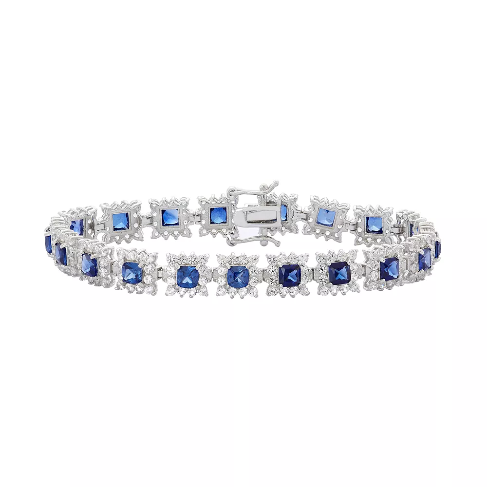 Adorned with lab-created blue and white sapphire gemstones, this sterling silver bracelet offers timeless style.