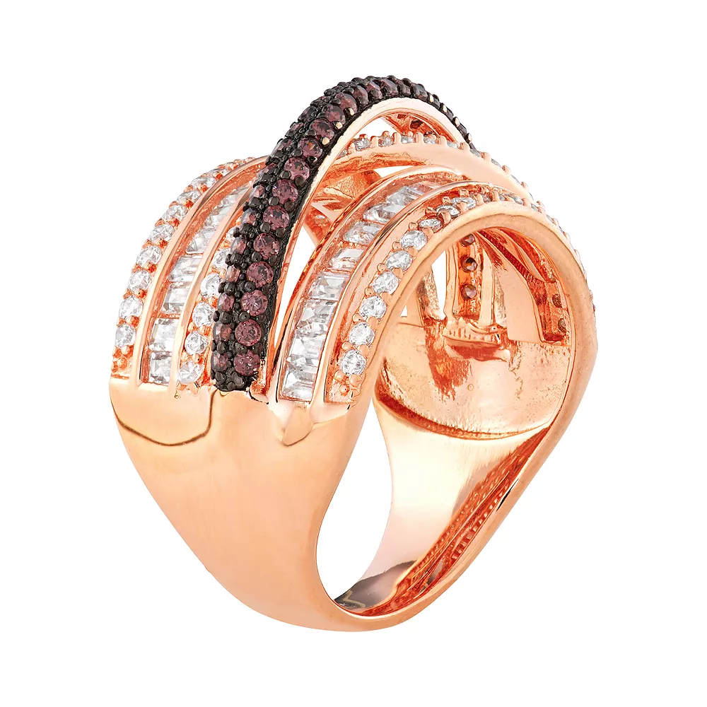 Decorated with cubic zirconia stones fashioned into a modern crossover design, this unique ring offers a distinctive look you’ll love.