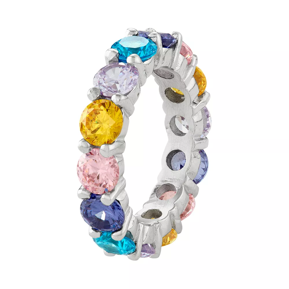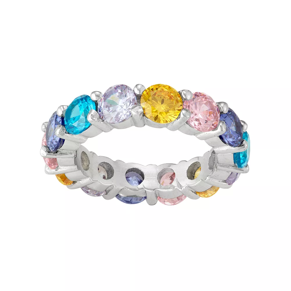 Add a flashy update to your favorite ensemble with this sterling silver ring, beautifully decorated with a fun and fashionable arrangement of colorful cubic zirconia stones.