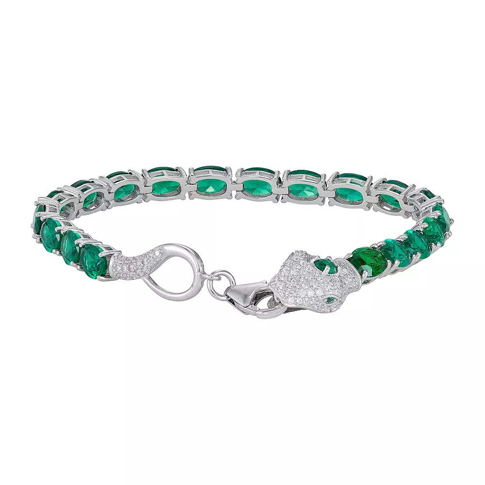 Featuring a snake motif lined with simulated emeralds, this sterling silver bracelet is a distinctive finishing touch.
