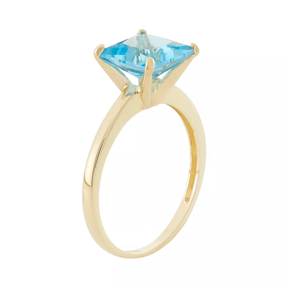 Add stunning sparkle to your ensemble with this 10k gold Swiss blue topaz ring.