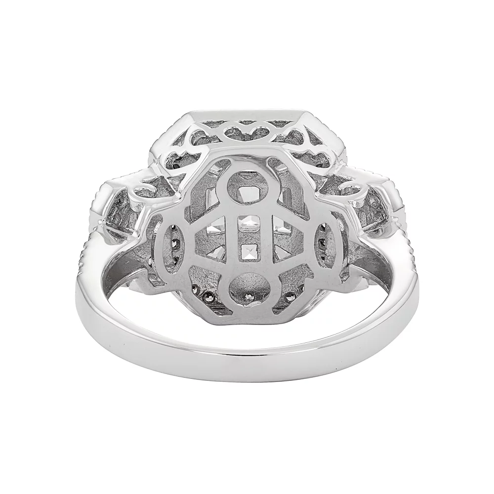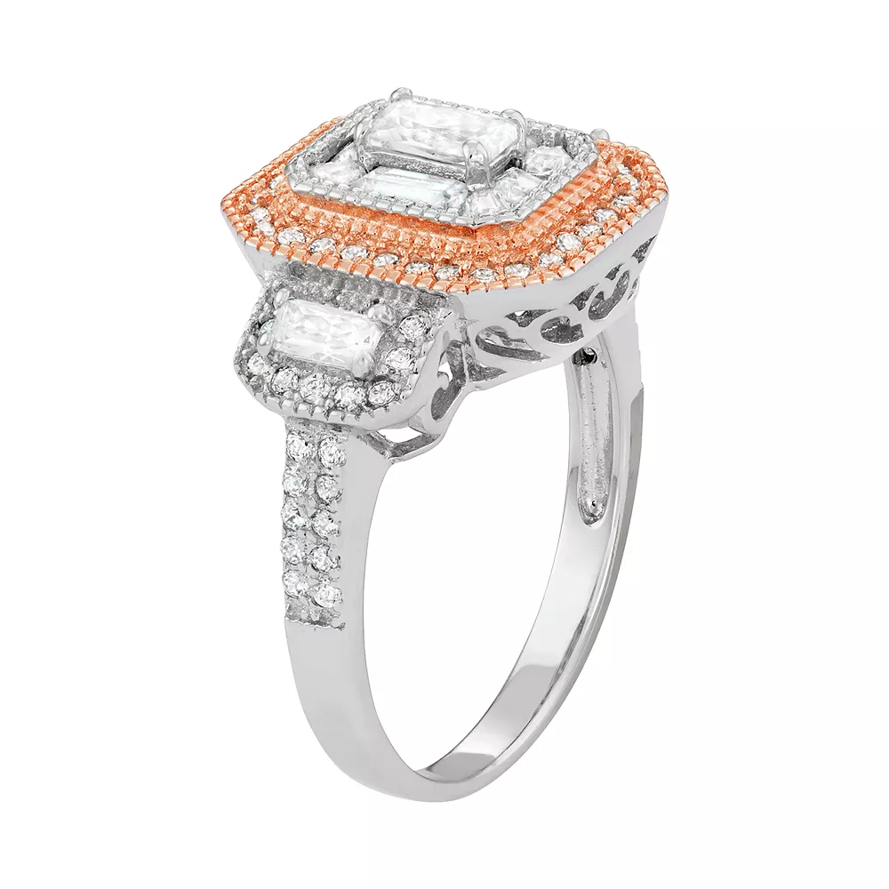 An array of sparkling cubic zirconia stones and milgrain detailing give this two-tone halo ring scintillating style.