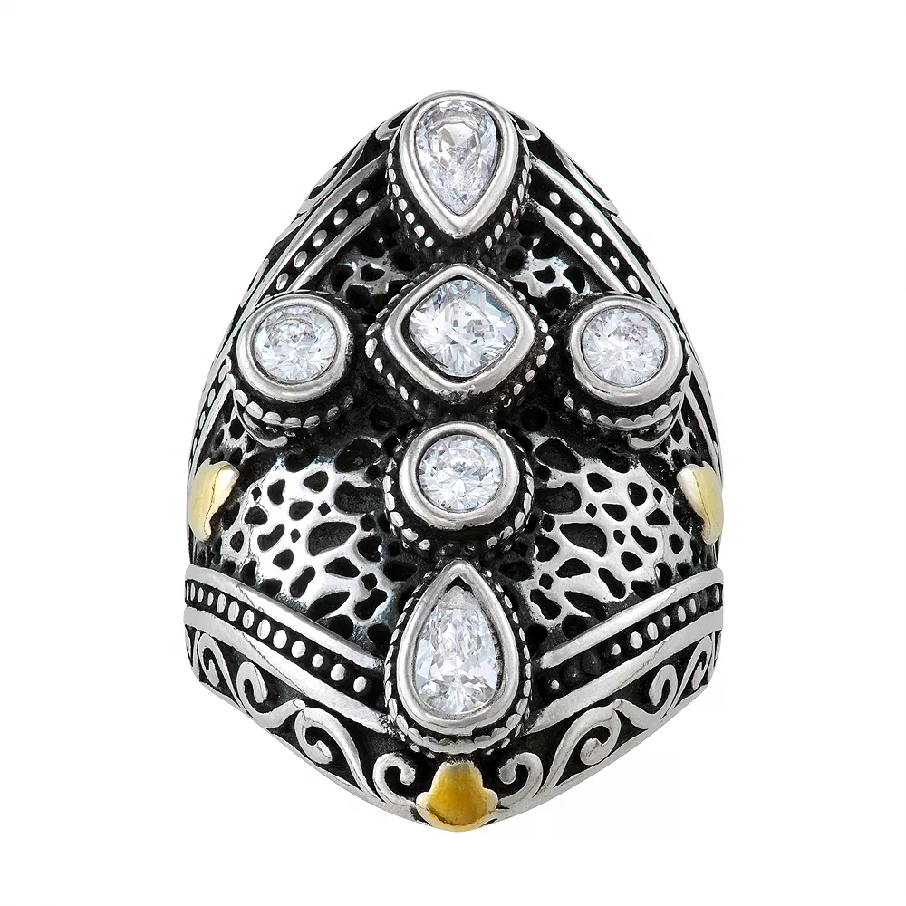 Designed with faceted stones and filigree accents, this two-tone sterling silver cross ring is a testament to your faith.